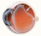 | 안구는 투명한 젤리성분인 유리체로 채워져 있습니다. 나이가 들면서, 유리체의 수분이 빠져나가 부피가 줄어들어 눈 뒷쪽의 망막으로부터 떨어지게 됩니다. 이것을 후유리체 박리증이라고 말하며 노화현상의 일종으로 생각합니다. 이 때 응축된 유리체로 인한 경미한 혼탁이 흔히 발생하며 빛이 통과하면서 망막에 그림자를 만들기 때문에 까만 점이나 날파리같이 보입니다. 흔히 `모기가 떠다닌다'고 하여 날파리증 또는 비문증 (飛蚊症) 이란 용어를 사용하기도 합니다. | ![]() |